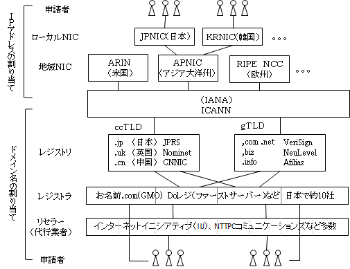 - 実際のドメイン名申請の受け付けは、レジストラが行う。レジストラは、取り扱うTLDがccTLDの場合はその国のレジストリ(jpならJPRS)。gTLDの場合は直接ICANNの認定を得る必要がある。複数のTLDを取り扱うこともできる。