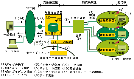 下図は、最も進んだ時期でのポケベルの通信システムで、図中の受信機がポケベルである。