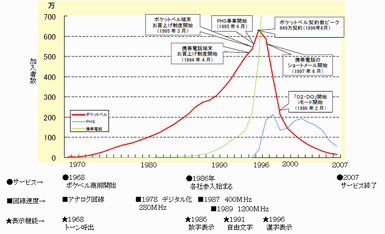 1996年には、ポケベルの加入者数はピークの1,078万人になった。