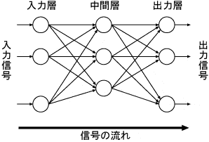 入力層のニューロンでは信号処理を行わず、受け取った入力信号をそのまま中間層のニューロンへ伝えるとする。中間層と出力層は上式により入力→出力の処理をして、出力信号を他のニューロンへ伝える。ここでは、中間層を一層としたが、多層にすることができる。人間の脳はもっと複雑なメカニズムになっているが、5層~10層程度で近似できるといわれている。