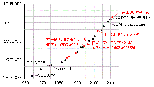 スーパーコンピュータの処理速度の推移(赤は国産機)