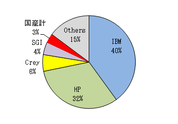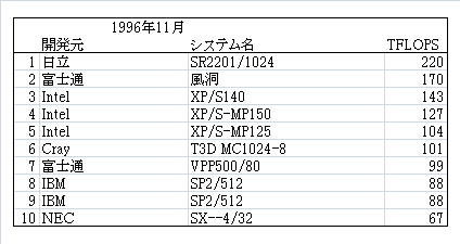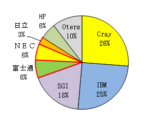 国産スーパーコンピュータ全盛期の1996年11月を対象に、2010年11月にTOP500の資料から作成した、上位10機種および50位までの国産機と、500機種のメーカー別のシェアを掲げる。この約15年の間に、大きな変化が起こったことがわかる。