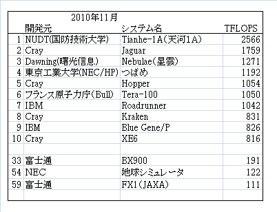 スーパーコンピュータ競争は、今後も激化するであろう。「京」も「TSUBAME」も短期間で首位の座を明け渡すことになるのは必然である。それに伴い本ページを改訂するのは面倒(!)なので、国産機がめでたく首位になったこの時点で終了する。
