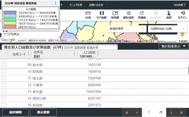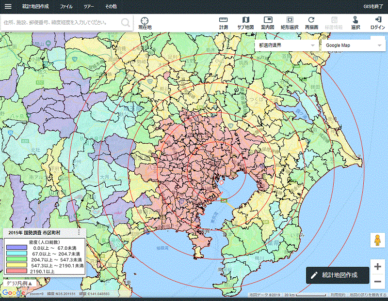 国勢調査など国が調査し、市町村単位、メッシュ単位などで集計しているデータベースを選択して、地図上に表示されるオンラインサービスです。地図そのものはGoogleマップを用いています。