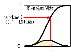 JavaScriptでの乱数発生関数には、0~1の一様分布を対象にした random() があるだけです。 random() を用いて正規分布や指数分布などに従う乱数を発生する関数を作成します。 その基本的な方法は、累積確率関数の逆関数(参照:確率統計分布)を用いる方法です。 累積確率関数は左図のように0~1の値をとるので、random() の値からxを求める逆関数により、分布に従う乱数が生成できます。 分布によっては、この逆関数が複雑な構造になる場合もあり、いろいろな代替手段が開発されています。