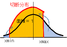 実務では、例えば成績の分布など正規分布に従うが、その範囲は0~100に限定されるときがあります。 また、シミュレーションを行うとき、あまりにも極端な値の乱数が出現すると、現実的ではない状況になります。 それを防ぐには右図のような切断分布に変形する必要があります。 ところが、元の平均や分散などの特性値を保持しながら切断分布に変形するには非常に複雑な計算になります。 そのため、ここでは例外を除き取り扱いません。