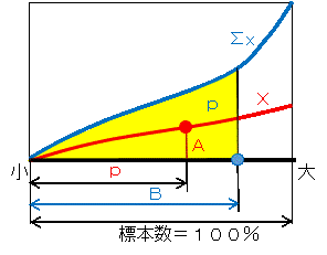 パーセント点とは、標本 x を昇順に並べたときに、指定した p よりも小さな標本の割合が p である x[i] の値 A のこと。 p = 0.25, 0.50, 0.75 の x[i] を、第1四分位点、中央値(メジアン)、第3四分位点という。 さらに、x[i] の累計の割合が p となる件数の割合 B も算出している。 ここでは、p を小数点で表示、複数個を与えることができる。