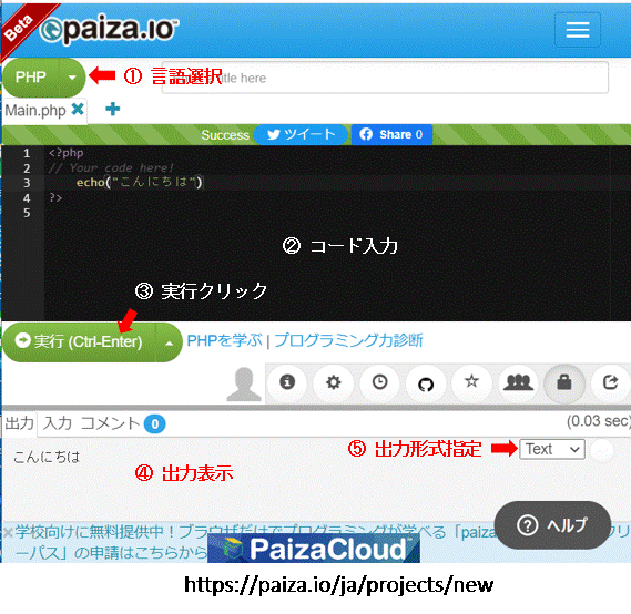 - 一つの画面で、PHPプログラムの作成とテストができる環境を公開提供してくれるサイトがあります。代表的なサイトのうち、ここでは piza.io を利用します。