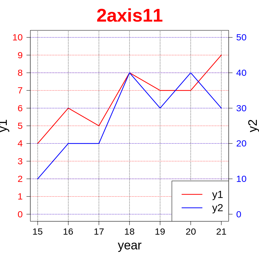 math12 に y2=x*x のグラフを重ねます。 前のグラフに重ねるので、次のグラフ作成の前に par(new=T) を記述します。 グラフの大きさを同一にするために、次のグラフの xlim と ylim は前のグラフと同一にします。 各種体裁は前のグラフが記述しているので、次のグラフでは重複しないようにします。