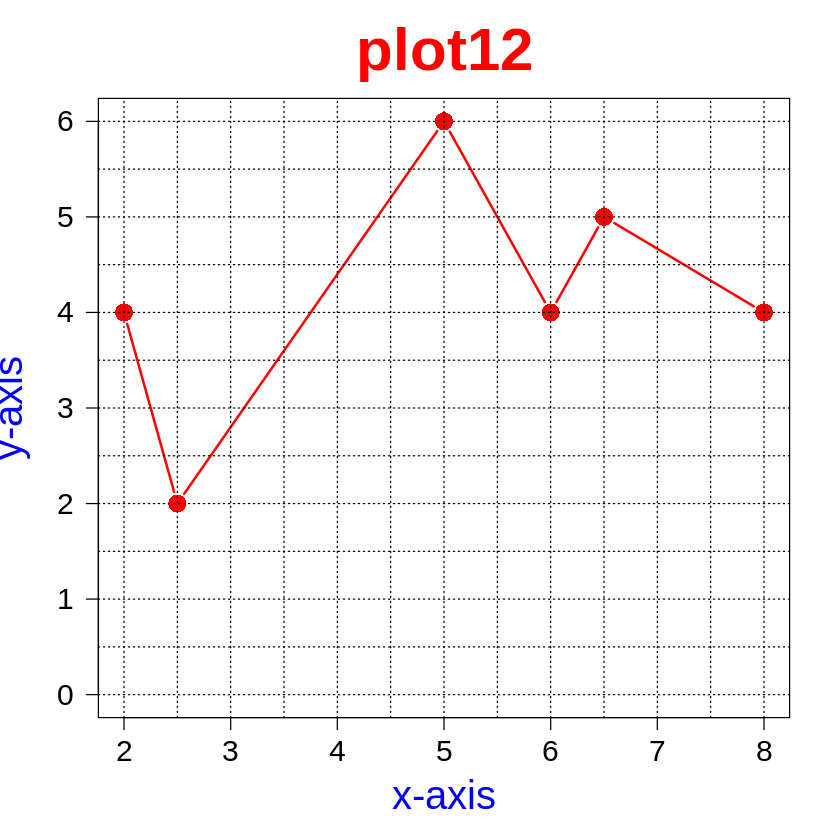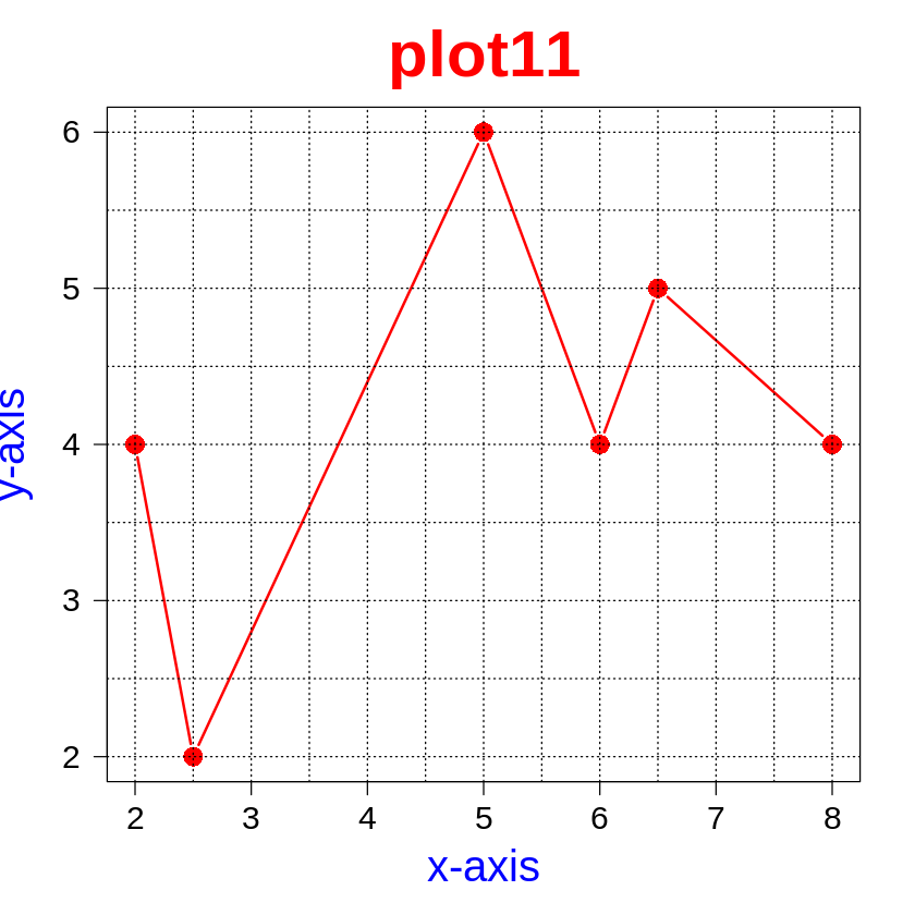 折線グラフは、散布図に type="b" を付加して、必要に応じて線に関するオプションを設定するだけです。散布図の部分を参照してください。