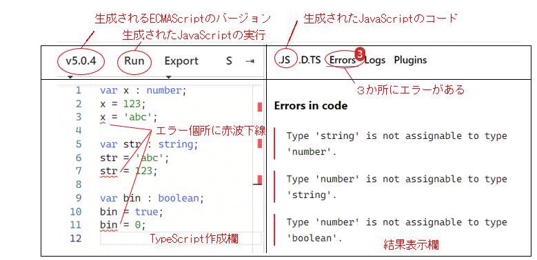 TypeScriptでは、そのような変数について、あらかじめ「静的型付け」で型を宣言しておき、JavaScriptのコード中に、それに反する記述があったときにエラーを指摘します。