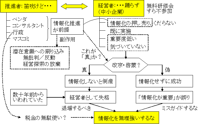 情報化礼賛論の氾濫により,いつの間にか「情報化は善である」という観念が経営者をはじめ関係者全員に刷り込まれてしまっているようです。このような風潮にあっては,情報化に反対するための理論武装をするのが困難です。情報化慎重論者=反動勢力とみなされる危険もあります。