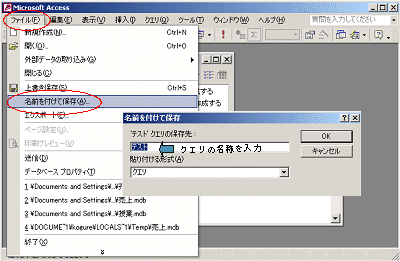 - ステップ5とステップ4を繰り返すことにより,そのクエリ(SQLプログラム)を保存したいときは,全体画面のメニュー[ファイル]→[名前をつけて保存]をすると,下図が表示されるので,新らしいクエリ名を入力して,[OK]をクリックします。