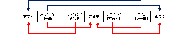 上図は、前要素と後要素の間に新要素を挿入するときの、ポインタの変化を示しています。事前は青のポインタになっていますが、新要素が入ることにより、赤のように変更します(逆に新要素を削除するときは、赤のポインタを青のように変更します)。