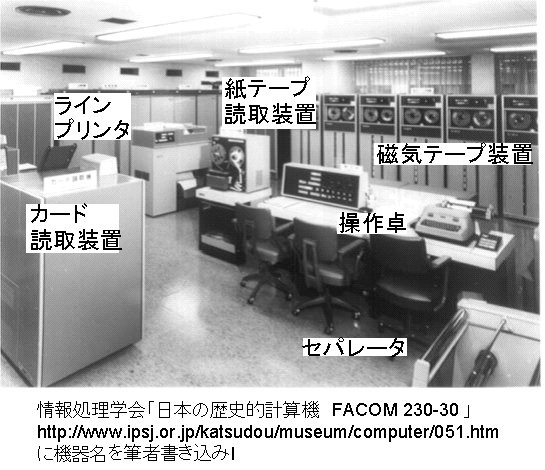 みなさんはコンピュータといえばパソコンのことと思うでしょうが,パソコンが実用的に普及したのは1980年代になってからです。それまでは,コンピュータといえば汎用コンピュータ(メインフレームともいう)のことだったのです。そして企業では,次第に少なくなってきましたが,現在でも汎用コンピュータを用いていることもあります。