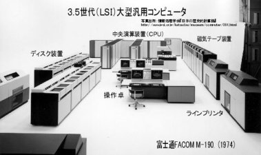 汎用コンピュータは,CPUに用いられている記憶素子により世代区分しています。最初に作られたコンピュータは,真空管を用いていましたが,トランジスタが発明され,多くのトランジスタを小さなチップに集積した集積回路(IC)の技術が発展しました。さらにその集積度が高密度になり,LSI,VLSIなどと呼ばれるようになりました。日本の大企業でコンピュータを本格的に導入し始めたのは1960年代ですが,ICを用いた第3世代が始まった頃だといえます。 ☆