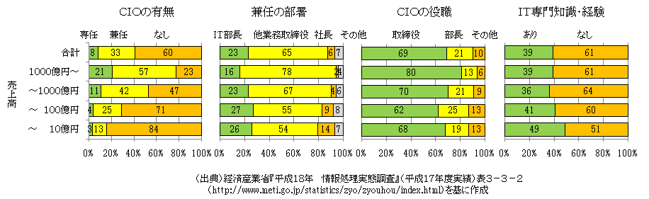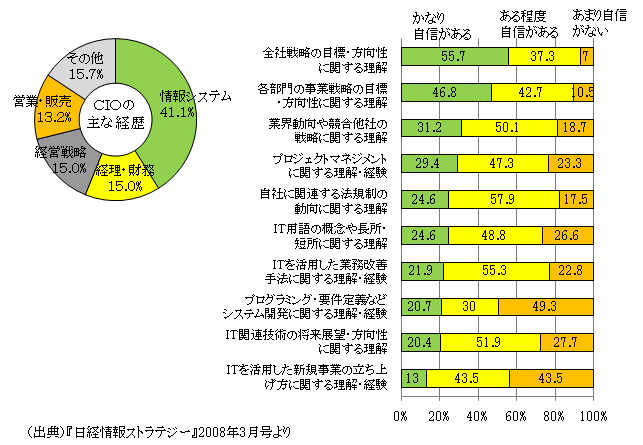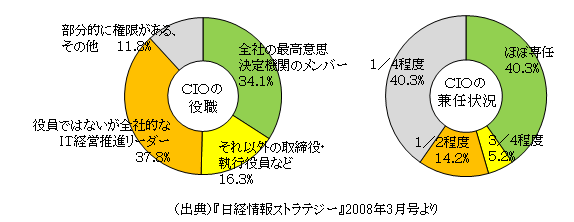 これを米国と比較すると、米国では全体の2/3近くが専任のCIOを有しているといわれています。また、ITの戦略的活用などの専門的な知識や経験を持っていることがCIOの条件だといわれています。すなわち、米国ではCIOがコンサルタントのような専門職になっているのです。(→その違いが生じた理由の考察)