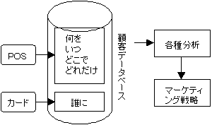 POSスーパーストアなど小売店ではPOSが広く採用されています。これはレジ作業の合理化に役立つだけではなく,「いつ,どこで,何を,どれだけ」購入したかを収集するのに役立つのです。 カードPOSデータだけでは,肝心の「誰が」が入手できません。それを得るために,小売店ではポイントカードやクレジットカードなどのカードを発行して,個人情報と購買情報を突き合せることにより,全体の顧客情報が実現できるのです。 |