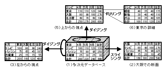 例えば,月別,商品別,支店別の売上データは4次元のデータになります。これが多次元データです。それを縦軸に商品,横軸に月をとれば2次元表になります。この表で東京支店,大阪支店,全支店合計の表を見るスライシング操作,縦軸を支店,横軸を月というように異なる視点で見るダイシング操作,支店別を店舗別に展開したり店舗別を支店別に集計するドリリング操作などを行なうことにより分析します。そのようなソフトウェアをOLAPツールといいます。