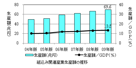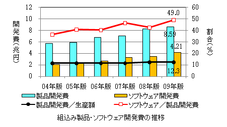 組込み関連産業生産額は高成長であり、2009年では約70兆円/年に達しました。これはGDPの13.5%になります。組込み製品は開発費の割合が高いのが特徴で12.3%程度で、製品開発費は8.6兆円/年になります。製品開発費のうち、約50%である4.2兆円/年が組込みソフトウェアの開発費です。そのため、2004年~2009年の組込みソフトウェアの平均成長率は15%に達します(経済産業省「組込みソフトウェア産業実態調査報告書」2009年版より)(図表等)。