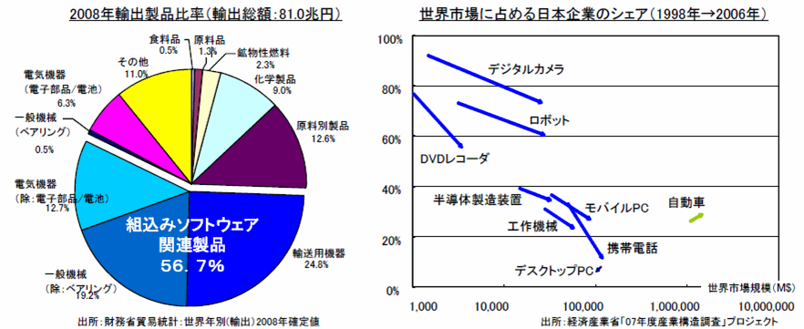 日本経済の成長のためには、この分野での国際競争力の優位性を維持する必要があります。実際、輸出総額のうち、組込み関連製品が過半数を占めています。