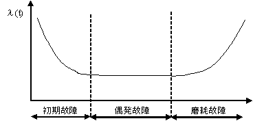 システムを構成する機器の故障率λ(t)と,利用し始めてからの経過時間tとの関係をグラフにすると,一般に図のような傾向の曲線になる。摩耗故障の期間に故障率の増加する度合いが最も高いと予想される機器はどれか。