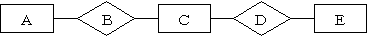 現行業務のERモデルを作成した結果の一部が下記である。A,B,C,D,Eに入るものの組み合わせとして最も適切なものはどれか。なお,□は実体を表し,◇は関連を示す。