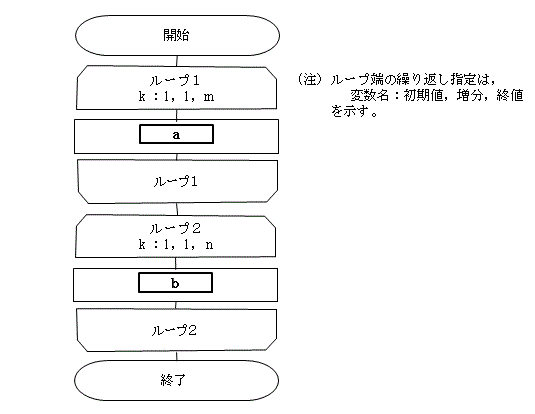 長さm,nの文字列をそれぞれ格納した配列X,Yがある。図は,配列Xに格納した文字列の後ろに,配列Yに格納した文字列を連結したものを配列Zに格納するアルゴリズムを表す流れ図である。図中のa,bに入れる処理として,正しいものはどれか。