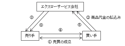 インターネットオークションなどで利用されるエスクローサービスの取引モデルの⑤に当てはまる行為はどれか。ここで,①~⑥は取引の順序を示し,③~⑥はア~エのいずれかに対応する。
