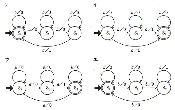 300円の商品を販売する自動販売機の状態遷移図はどれか。ここで,入力と出力の関係を"入力/出力"で表し,入力の"a"は"100円硬貨"を,"b"は"100円硬貨以外"を示し,S0~S2は状態を表す。入力が"b"の場合はすぐにその硬貨を返却する。また,終了状態に遷移する際,出力の"1"は商品の販売を,"0"は何もしないことを示す。