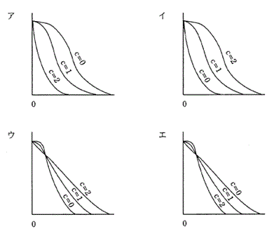 Nとnを一定にしてcを0,1,2と変えたときの,OC曲線の変化の傾向を表す図はどれか。