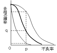 品質管理における検査特性曲線(OC曲線)は,通常,横軸にロットの不良率を,縦軸にはロットの合格の確率を目盛ったものである。大きさNのロットから,大きさnのサンプルを抜き取り,このサンプル中に見いだされた不良個数が合格判定個数c以下のときはロットを合格とし,cを超えたときはロットを不合格とする。