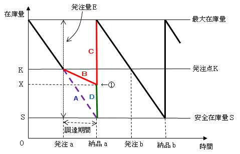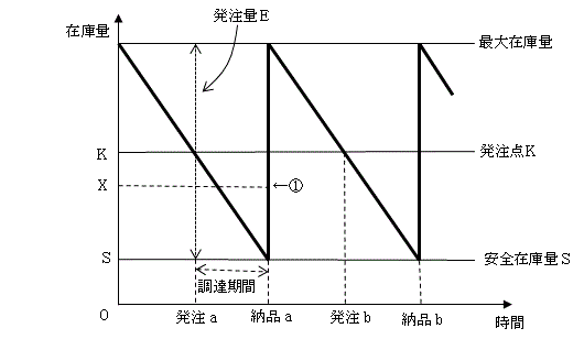図は,定量発注方式の在庫モデルを表している。発注aの直後に資材使用量の予測が変わって,納品aの直前の時点における在庫量予測が安全在庫量Sから①で示されるXになるとき,発注a時点での発注量Eに対する適切な変更はどれか。ここで,発注直後の発注量の変更は可能であり,納品直後の在庫量は最大在庫量を超えないものとする。