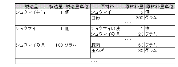 表は,シュウマイ弁当の原材料表の一部である。100個のシュウマイ弁当を製造するために必要な豚肉の量は何グラムか。ここで,このシュウマイ弁当にはシュウマイ以外に豚肉を使う料理は入っていないものとし,製造過程での原材料のロスはないものとする。
