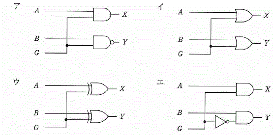 入力G=0のときはX=A,Y=Bを出力し,G=1のときはX=¬A,Y=¬Bを出力する回路はどれか。