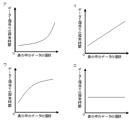 ハッシュ表の理論的な探索時間を示すグラフはどれか。ここで,シノニムは発生しないものとする。