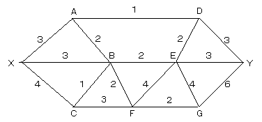 次のネットワーク図の数値は,二つの地点の間に同時に設定できる論理回線の多重度を示している。このうち,多重度を1だけ大きくすることによって,XY間に設定できる最大論理回線数を増やせる区間はどれか。