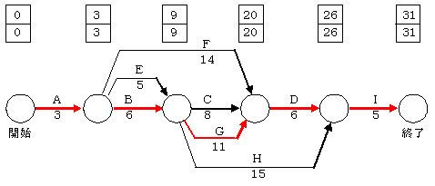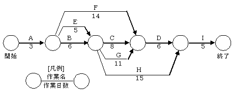 図は,あるプロジェクトの作業(A~I)とその作業日数を表している。このプロジェクトが終了するまでに必要な最短日数は何日か。