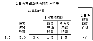 ある営業部員の1日の業務活動を分析した結果は,表のとおりである。営業活動支援システムの導入によって訪問準備時間が1件あたり0.1時間短縮できる。総業務時間と1件あたりの訪問時間を変えずに,1日の訪問件数を6件にするには,「その他業務時間」を何時間節減する必要があるか。