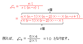 n個のなかからr個を取り出した組合せの数を nCr で表します。例えば、袋の中にA~Eの5個の玉があり、それから2つ取り出したときの組合せの数は、下表のようになり、5C2=10になります。