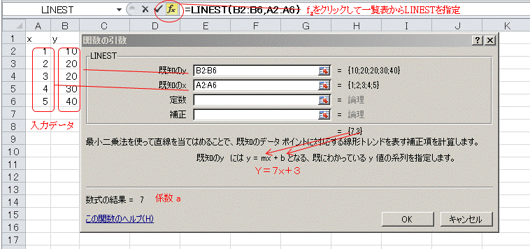 データを入力して、関数[fx]をクリックすると関数の一覧表が表示されるので、LINEST を指定すると図が表示されます。