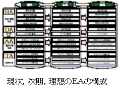 そのPDCAをEAの運営で考えれば,「管理体制とコントロールの確立」-「アプローチ」-「現状モデルの作成」-「理想モデルの作成」-「次期移行計画の策定」-「EAの利用(実施)」-「EAの保守」-「モニタリング・コントロール」と分解できます。これをEAサイクルといいますが,EAサイクルを円滑にまわすことが,EAの効果をあげる基本となります。