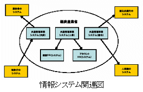 - 個々の情報システムの間の関連を示したものです。業務・システムの処理過程において情報システム間でやりとりされる情報の種類及び方向を図式化することにより明確にします。これにより,システム全体をいくつかのサブシステムに切り分けるときに,全体の観点からどうまとめるかを検討することができます。