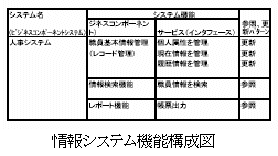 - 情報システム関連図をベースにして,個々の情報システムがどのような機能を持てばよいかに図式化したものです。ここまでの策定により,構築するべき情報システムの論理的な概要が作成されたことになります。
