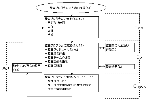 5.1 一般 5.2 監査プログラムの目的の確立 5.3 監査プログラムのリスク及び機会の決定及び評価 5.4 監査プログラムの確立 5.5 監査プログラムの実施 5.6 監査プログラムの監視 5.7 監査プログラムのレビュー及び改善