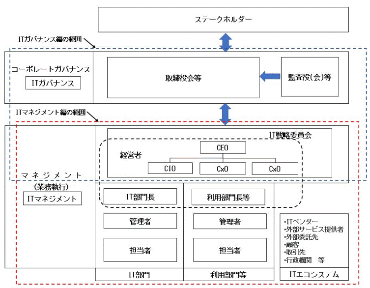 上図は、各機能が分離している環境を想定しているが、小規模組織では、コーポレートガバナンスとマネジメント(業務執行)の機能、CEOとCIOの機能が分離していないこともある。