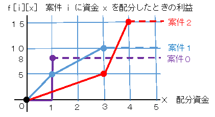 案件0,1,2の案件への資金配分による利益が右図のとおりだとします。