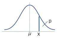 ある値 x が正規分布(μ,σ)に従う母集団に属する確率 p を求める。