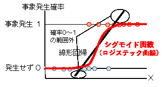 通常の重回帰による線形回帰(判別式)では、図の黒い直線のようになります。これを確率の0~1の範囲に変換する方法はいろいろありますが、その代表的なのが、図の赤い曲線に変換する方法です。このような曲線はロジスティック曲線(群)と呼ばれます。「ロジスティック回帰」というのはそのためです。