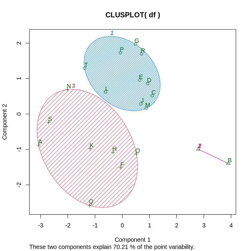 ■■■■■ 入力データ df 次の構成になります。 # x1 x2 x3 x4 x5 x6 ← colnames 特性名 # A 3 4 4 5 4 4 # B 6 6 7 8 7 7 # C 6 5 7 5 5 6 # D 6 7 5 4 6 5 # E 5 7 6 5 5 5 # F 4 5 5 5 6 6 # G 6 6 7 6 4 4 # H 5 5 4 5 5 6 # I 6 6 6 7 7 6 # J 6 5 6 6 5 5 # K 5 4 4 5 5 5 # L 5 5 6 5 4 5 # M 6 6 5 5 6 5 # N 5 5 4 4 5 3 # O 5 6 4 5 6 6 # P 6 6 6 4 4 5 # Q 4 4 3 6 5 6 # R 6 6 7 4 5 5 # S 5 3 4 3 5 4 # T 4 6 6 3 5 4 # └ rownames データの名称 指定クラス数 <- 3 # K-Means法では、先にいくつのグループ(クラス)に区分するかを指示します。 ■■■■■ クラスタリング library(cluster) # cluster はクラスタリングに有用な関数を集めたライブラリです。 # kmeans() はclusterの持つ関数です。 kekka <- kmeans(df, 指定クラス数) # この1行だけで求める結果が得られます。 kekka # K-means clustering with 3 clusters of sizes 2, 8, 10 # 各クラスに振り分けられたデータ数 # Cluster means: クラス別の各列の平均値 # x1 x2 x3 x4 x5 x6 ← 特性値 # 1 6.0 6.0 6.5 7.50 7.000 6.5 ┐ # 2 4.5 4.5 4.0 4.75 5.125 5.0 ├ 3つのクラスにクラスタリングしました # 3 5.6 5.9 6.1 4.70 4.900 4.9 ┘(計算プロセスの都合で異なるクラス分けになることがあります # # Clustering vector: 各行がどのクラスに入るかの表 # A B C D E F G H I J K L M N O P Q R S T # 2 1 3 3 3 2 3 2 1 3 2 3 3 2 2 3 2 3 2 3 割り付けられたクラス # # Within cluster sum of squares by cluster: # 1.500 30.375 30.100 クラスタリングしたときの級内平方和 これが小さいほどよい # (between_SS / total_SS = 51.2 %) 級間平方和/全体平方和 これが大きいどどよい # # Available components: このkekka から取り出せる情報の一覧(次の項) # "cluster" 上のClustering vectorと同じです。 # "centers" # "totss" # "withinss" # "tot.withinss" # "betweenss" # "size" # "iter" # "ifault" 〓〓〓 各種情報出力 上の kekka 出力の主要変数を取り出す方法です kekka$centers # x1 x2 x3 x4 x5 x6 ← 特性値 # 1 6.0 6.0 6.5 7.50 7.000 6.5 ┐ # 2 4.5 4.5 4.0 4.75 5.125 5.0 ├ 3つのクラスにクラスタリングしました # 3 5.6 5.9 6.1 4.70 4.900 4.9 ┘(計算プロセスの都合で異なるクラス分けになることがあります kekka$totss # 126.95 全体平方和 kekka$withinss # 1.500 30.375 30.100 級内平方和 kekka$tot.withinss # 61.975 級内平方和計 kekka$betweenss # 64.975 級間平方和 kekka$size # 2 8 10 各クラスに割り付けられたデータ数 kekka$iter # 3 クラスタリング最適への実行反復回数 kekka$ifault # 0 最終実行でのエラーコード # 〓〓〓 cluster 結果の表 grp <- kekka$cluster # 各データが割り付けられたクラスの表 # A B C D E F G H I J K L M N O P Q R S T # 2 1 3 3 3 2 3 2 1 3 2 3 3 2 2 3 2 3 2 3 cbind(df, grp) # 入力データに結果データを組み込む # x1 x2 x3 x4 x5 x6 grp # A 3 4 4 5 4 4 2 # B 6 6 7 8 7 7 1 # C 6 5 7 5 5 6 3 # D 6 7 5 4 6 5 3 # E 5 7 6 5 5 5 3 # F 4 5 5 5 6 6 2 # G 6 6 7 6 4 4 3 # H 5 5 4 5 5 6 2 # I 6 6 6 7 7 6 1 # J 6 5 6 6 5 5 3 # K 5 4 4 5 5 5 2 # L 5 5 6 5 4 5 3 # M 6 6 5 5 6 5 3 # N 5 5 4 4 5 3 2 # O 5 6 4 5 6 6 2 # P 6 6 6 4 4 5 3 # Q 4 4 3 6 5 6 2 # R 6 6 7 4 5 5 3 # S 5 3 4 3 5 4 2 # T 4 6 6 3 5 4 3 ■■■■■ クラスタ散布図の表示 # 上の表があれば、自分で多様な加工ができますが、専用の関数を使えば簡単です。 clusplot(df, grp, color=TRUE, shade=TRUE,labels=2, lines=0) # 第1主成分を横軸1、第2主成分を縦軸にして各データの散布図を作成します。